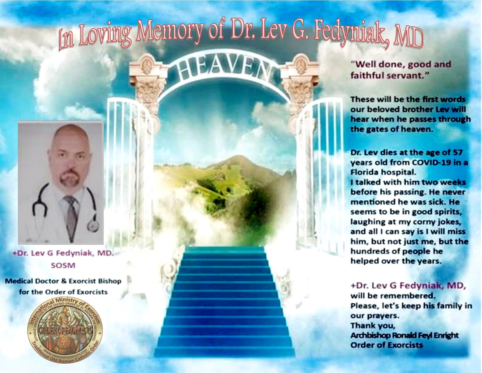 Dr. Lev, as we knew him with great affection, was a devoted member of our organization for many years, serving faithfully as both a Medical Doctor and Exorcist Bishop for the Order of Exorcists. His dual calling—healing both body and spirit—exemplified his deep commitment to serving others in Christ’s name.